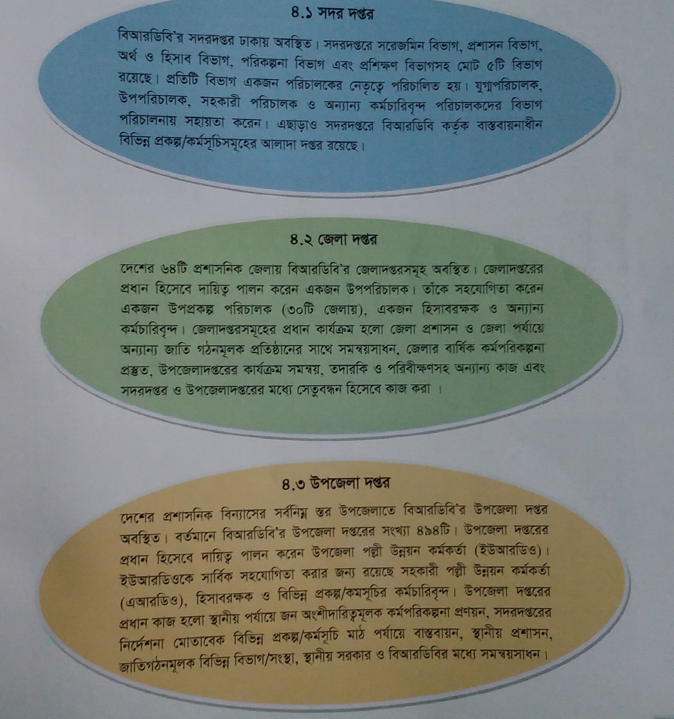 বিআরডিবির সকল কার্যক্রম মহাপরিচালকের সার্বিক তত্ত্বাবধানে পরিচালিত হয়। প্রধান কার্যালয় ও মাঠ কার্যালয় সম্বলিত “দ্বি-স্তর” বিশিষ্ট প্রশাসনিক ব্যবস্থার মাধ্যমে সকল কার্যক্রম বাস্তবায়ন করা যায়। সরেজমিন বিভাগের সার্বিক তত্ত্বাবধানে মাঠ পর্যায়ের কার্যক্রম পরিচালিত হয়। মাঠ পর্যায়ের কার্যালয়ের মধ্যে রয়েছে জেলাদপ্তর ও উপজেলা দপ্তর। উপজেলা দপ্তর মাঠ পর্যায়ে কার্যক্রম বাস্তবায়ন ও সরাসরি জনগনের সেবা প্রদান করে। সদর দপ্তর ও উপজেলা দপ্তরের মধ্যে সেতুবন্ধন হিসেবেকাজ করে জেলাদপ্তর। বিভাগীয় পর্যায়ে বিআরডিবির দপ্তর সৃজনের কার্যক্রম চলমান রয়েছে।